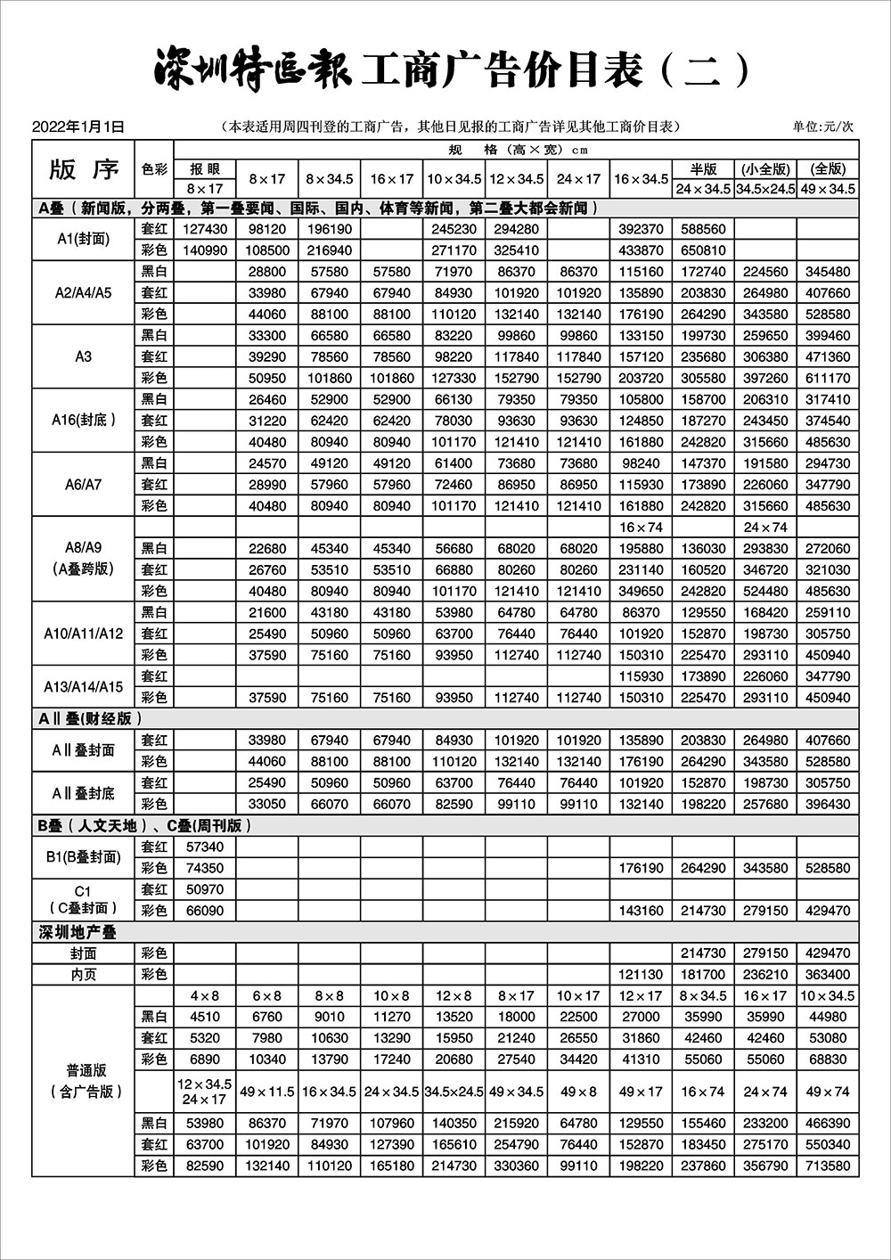 深圳特區(qū)報工商廣告價目表