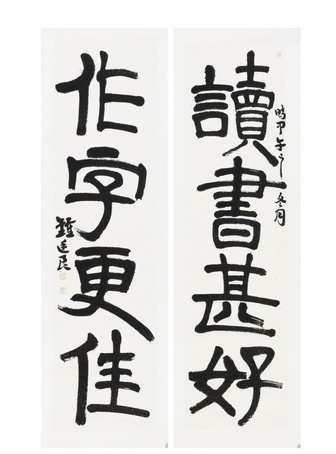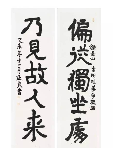 鐘廷良學書的過程離不開他的收藏,也得益于他的收藏!2011年收得清代書壇巨匠伊秉綬一副對聯(lián)后,細細研摩臨寫。此后,也有所悟所得。2012年收得民國舊拓“泰山金剛經(jīng)”集聯(lián)后,對泰山金剛經(jīng)刻石奉為至尊,敬若神明。爾后,凡作大字,皆以其為架構,而其書也漸有可觀者。由于長期從事文字工作之關系。讀書,亦成了鐘廷良生活的一部分。其深知唯有讀書方能為書法注入養(yǎng)分。唯有知識方能豐富書法內涵。鐘廷良的書法,尊崇于中國傳統(tǒng)文化所倡導的書論和畫理。在學習古人、先賢經(jīng)典的基礎上,小心求索,認真創(chuàng)作。既注重以古為師,又融匯時代精神,孜孜不倦,其書漸入佳境。