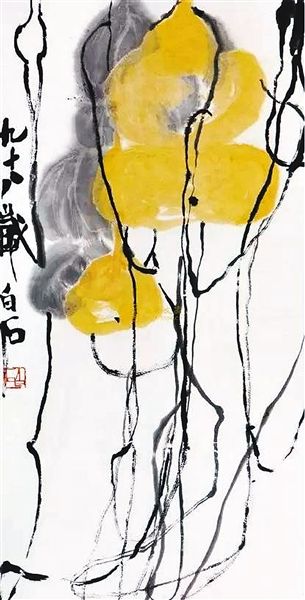 齊白石的《葫蘆》,被稱為是齊白石的絕筆,據(jù)說當(dāng)時齊白石為了畫這幅畫,一天早晨起來,沒有人攙扶,他自己從臥室踉踉蹌蹌地走進(jìn)畫室,站在桌前,擼起袖子,畫下了這一幅畫。據(jù)畫家李可染回憶,當(dāng)時的齊白石已經(jīng)是老糊涂了,“九”字不知道該怎么寫,到了“歲”就直接寫錯了,只能夠憑自己的直覺畫畫,即便是畫了一輩子的畫,但是到最后由于體力和腦力的不支,實在是畫不出來了。齊白石一開始用黃墨去畫葫蘆,畫下正確的一筆,一大一小,一前一后,一上一下。但當(dāng)他接著去畫葉子的時候出錯了,把葉子順即也畫成了葫蘆,且葫蘆留白處冒出兩筆淡墨,就好像葫蘆被打了兩個洞。當(dāng)畫藤蔓時,又恍惚了,畫著畫著又成葫蘆了。齊白石老人在做這幅畫時已經(jīng)是精力透支了,能畫出樣子來已經(jīng)實屬不易了,但是我們可以看到,其實齊老畫的這幅畫是別有一番風(fēng)韻在的,比如說他畫的藤蔓,這藤蔓真是絕了,能夠在不知不覺中畫出葫蘆的成熟、滄桑,把經(jīng)過風(fēng)吹雨打后形成的那種彎曲,表現(xiàn)得淋漓盡致。