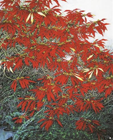 據(jù)閆國星介紹,這幅作品是他的老師給他布置的“命題作文”,為了完成作品,他特地坐飛機(jī)去西雙版納觀察野生一品紅,并在那里住了一個(gè)月,專門畫這個(gè)題材。因?yàn)轭}材新穎,傳統(tǒng)的筆墨無法表達(dá)其神韻,因此在畫法上,閆國星進(jìn)行了大膽創(chuàng)新,在傳統(tǒng)畫法中融入現(xiàn)代畫法,最終這幅佳作才得以問世。