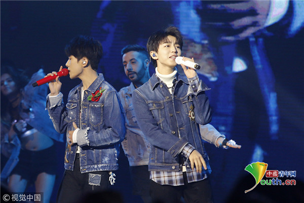 ??? 北京,12月12日晚,王俊凱、易烊千璽現(xiàn)身某活動,兩人身穿牛仔外套獻(xiàn)唱嗨翻全場,又換上紅色衛(wèi)衣舉廣告宣傳標(biāo)語