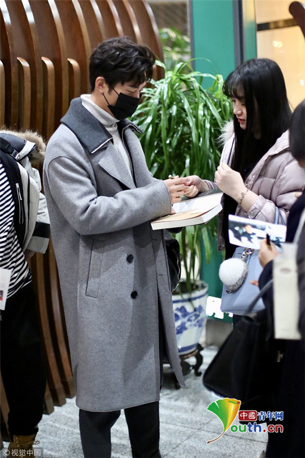 ??2017年12月13日,北京,竇驍身著灰色大衣、戴口罩現(xiàn)身機(jī)場(chǎng),為粉絲大方簽名,見(jiàn)鏡頭開(kāi)心比V揮手親和力滿(mǎn)分。