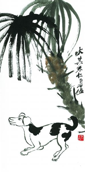 齊白石以畫(huà)草蟲(chóng)花卉聞名于世,他的動(dòng)物畫(huà)比較少見(jiàn)。北京畫(huà)院藏有一套他畫(huà)的《十二生肖》,其中里面就有一幅描繪狗的《吠其不仁》。這里引用了一個(gè)典故,《史記》淮陰侯列傳云:“跖之狗吠堯,堯非不仁,狗因吠,非其主?!币馑际钦f(shuō),狗對(duì)堯吠,并不是堯不仁,而是因?yàn)閳虿皇撬闹魅?。齊白石題畫(huà)“吠其不仁”,就是借用這個(gè)典故,贊揚(yáng)了狗對(duì)主人的忠心。齊白石畫(huà)的狗,不是寫(xiě)實(shí)的,而是意筆,用筆不多,但看門(mén)狗的神態(tài)盡顯無(wú)遺。齊白石曾畫(huà)過(guò)數(shù)幅狗類(lèi)的畫(huà)作,都是一個(gè)姿態(tài),可以看出用的是一個(gè)畫(huà)稿。他在1936年客居成都時(shí)也畫(huà)過(guò)《守門(mén)犬》,筆墨非常類(lèi)似,只是配景不同。齊白石雖然是木匠出身,但他作畫(huà)每有題詩(shī)或典故,使他的畫(huà)更具有文人畫(huà)的韻味。