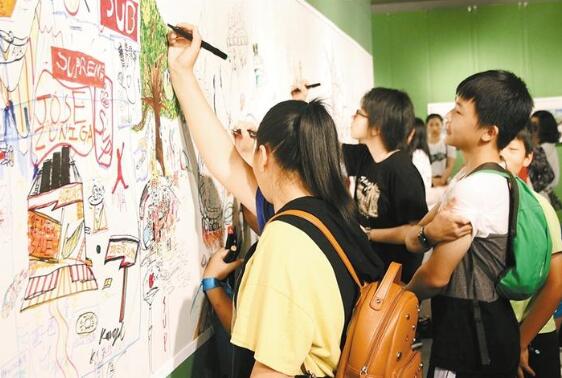 參加繪畫創(chuàng)作的馮羿飛小朋友說:“作為一名深圳孩子,我感覺自己非常幸運。我們生活在這個美麗、有激情、有活力的國際化城市,在成長過程中也見證了她的變化?!眳⒓赢嬚沟男‘嫾覀儸F(xiàn)場集體創(chuàng)作了《未來深圳》10米長卷,此次畫展的作品被編印成精美畫冊。(記者 張賀敏文/圖)