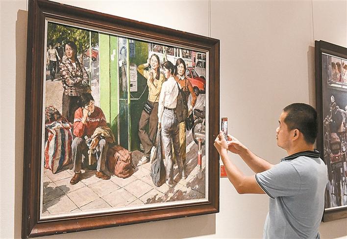 市民在深圳建市40周年美術(shù)作品展上拍攝留念。