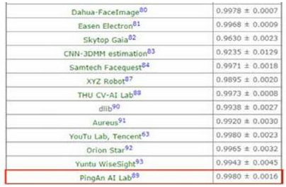 5月9日,國際權威人臉識別數據庫LFW(Labeled Faces in the Wild)最新公布的測試結果顯示,平安集團旗下平安科技的人臉識別技術以99.8%的識別精度和最低的波動幅度領先國內外知名公司,位居世界第一。該精度為LFW所公布的最佳成績,也是平安科技人工智能實驗室取得的里程碑式成果。此外,經國家公安部第三研究所認證中心權威認證,平安科技人臉識別技術同樣獲得識別精度99.84%的檢測結果,并榮獲檢測報告證書。