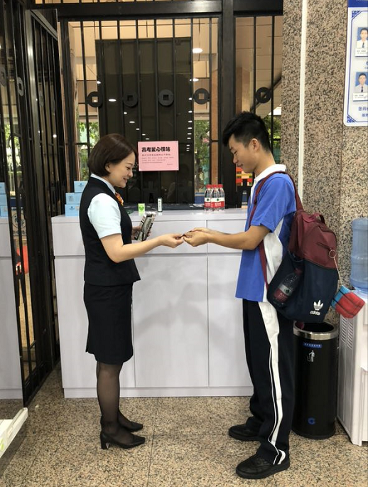 中午時(shí)分,一位紅嶺中學(xué)的考生在銀行大堂經(jīng)理的熱情招呼下免費(fèi)領(lǐng)取了文具盒礦泉水。通過聊天,這位考生表示今天上午考得很好,對建行的助力高考愛心驛站服務(wù)表示感謝。(通訊員 梁莉)