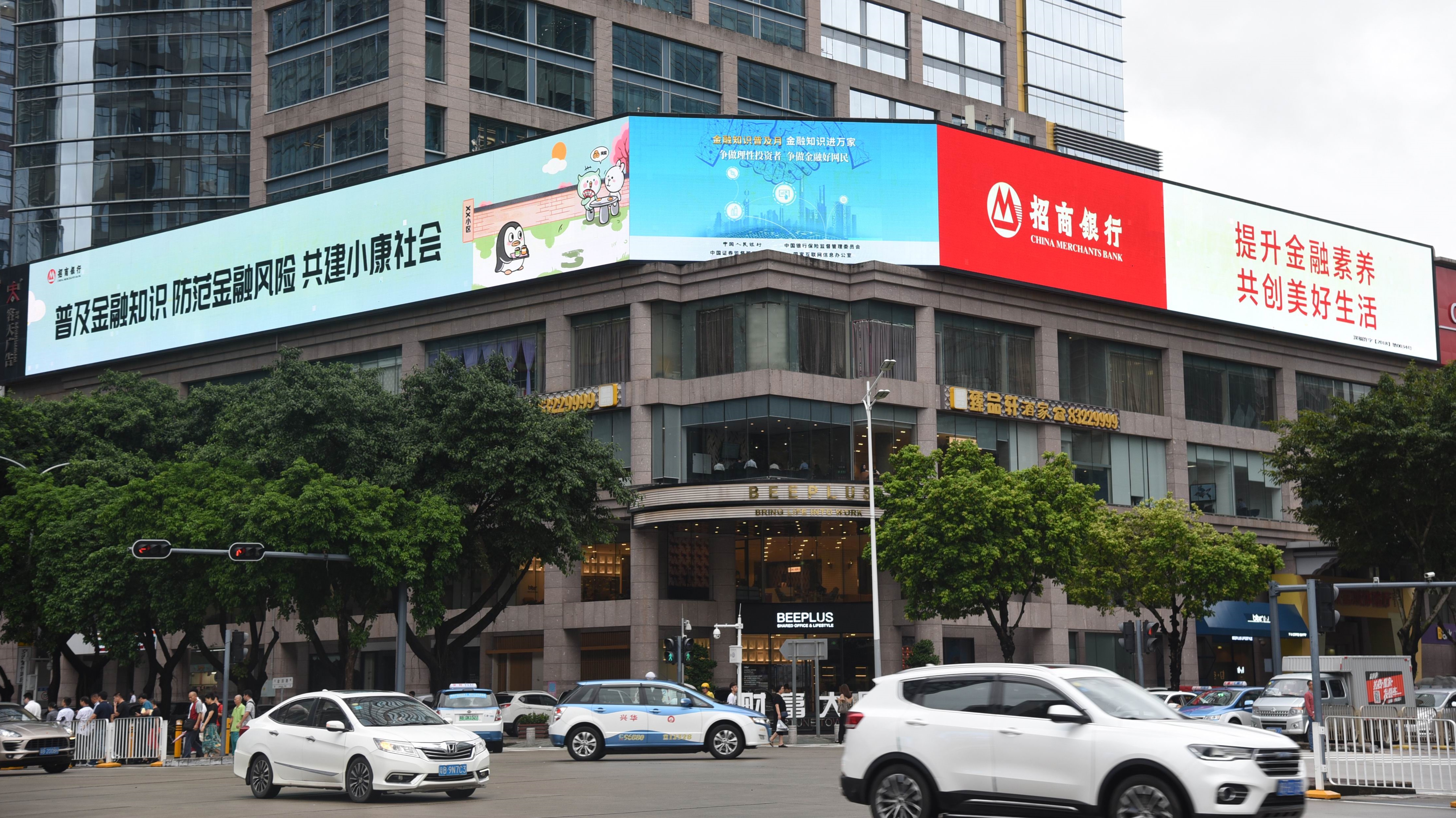 招商銀行除布局全轄網點營業(yè)廳滾動播放活動口號、總分行特色金融宣教片外,同時在財富大廈三面LED電子屏投放大型戶外廣告,進一步擴大宣教受眾面,消保品牌宣傳效果顯著。