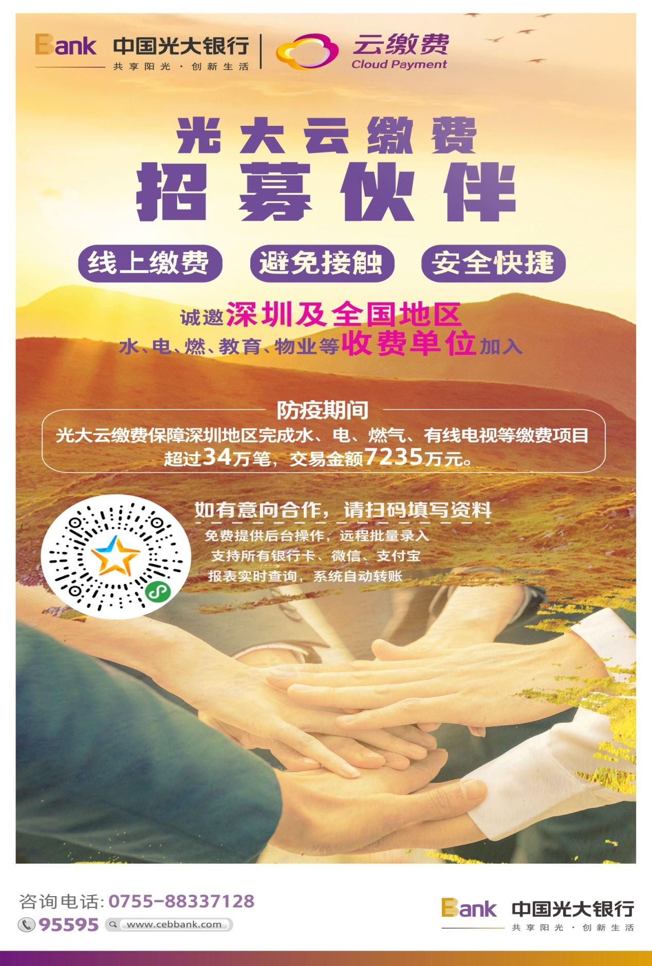 見圳客戶端·深圳新聞網(wǎng)2月26日訊 守望相助,共克時(shí)艱。面對(duì)新型冠狀病毒疫情防控的緊張形勢(shì),為有效阻斷病毒傳播渠道,光大銀行深圳分行積極響應(yīng)國(guó)家號(hào)召,充分發(fā)揮云繳費(fèi)線上便民繳費(fèi)服務(wù)優(yōu)勢(shì),全力保障全國(guó),特別是重點(diǎn)地區(qū)水、電、燃等主要生活繳費(fèi)線上通道穩(wěn)定暢通運(yùn)行,足不出戶,完成各類繳費(fèi),最大限度降低了居民的出行風(fēng)險(xiǎn),全面助力打贏“防疫”阻擊戰(zhàn)。