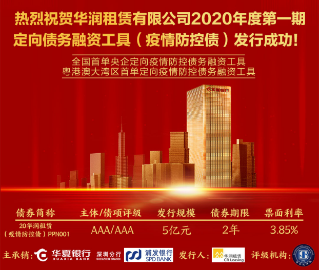 2月28日,由華夏銀行深圳分行主承銷(xiāo)的華潤(rùn)租賃有限公司2020年度第一期定向債務(wù)融資工具(疫情防控債)成功發(fā)行。