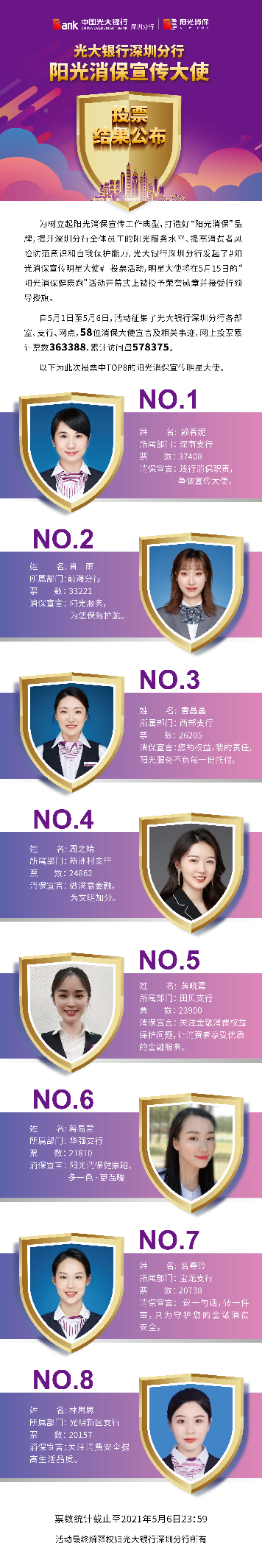 深圳新聞網(wǎng)·見圳客戶端2021年5月8日訊 昨日,光大銀行深圳分行“陽光消保宣傳明星大使”線上投票圓滿結(jié)束,從58名宣傳大使中投票產(chǎn)生了賴春妮、肖雨、曹晶晶、周之靖、黃曉霞、蔣易萱、曾粵玲、林思思8名陽光消保宣傳明星大使。明星大使將在5月15日的“陽光消保健康跑”活動開幕式上被授予榮譽勛章并接受行領(lǐng)導(dǎo)授旗。5月1日,光大銀行深圳分行發(fā)起了“陽光消保宣傳明星大使”線上投票,旨在樹立起陽光消保宣傳工作典型,打造“陽光消保”品牌,提升深圳分行全體員工的陽光服務(wù)水平,提高消費者風(fēng)險防范意識和自我保護能力,提升光大在深圳地區(qū)的品牌影響力。投票活動得到社會熱烈響應(yīng),據(jù)統(tǒng)計,此次累計票數(shù)達363388次。