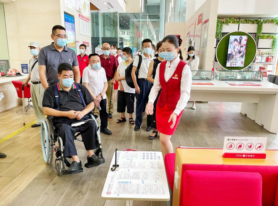 交流座談會結束后,全體黨員干部來到中信銀行深圳城市廣場旗艦支行現(xiàn)場體驗網(wǎng)點無障礙設施和服務,支部黨員與障礙人士現(xiàn)場溝通交流,為改進無障礙服務提出有益建議。