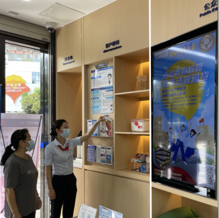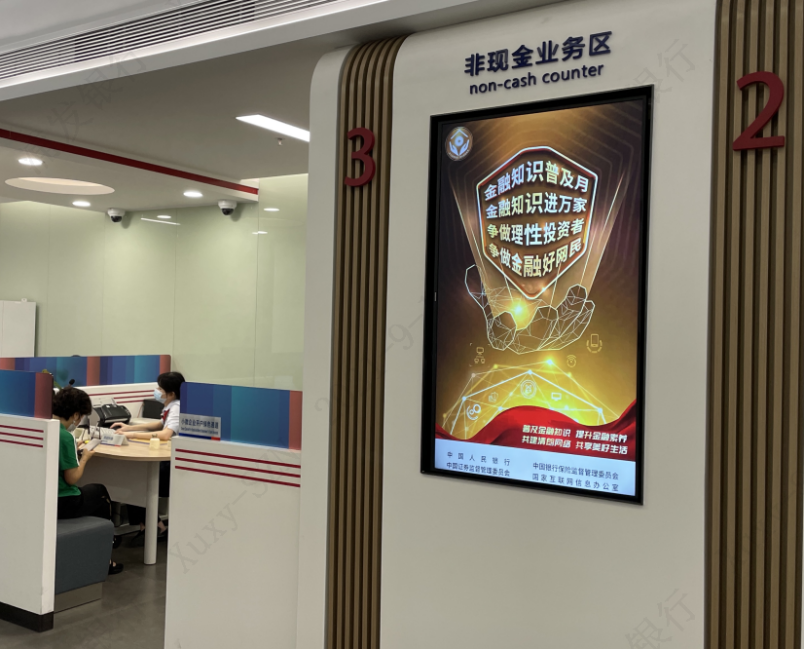 在網(wǎng)點營業(yè)大廳內(nèi),電子屏中的2021年金融知識普及月海報營造了良好宣傳氛圍。金融之手,強(qiáng)而有力,各營業(yè)網(wǎng)點一手承接了金融知識普及多方面的內(nèi)容,共同構(gòu)建了線上線下、電信、網(wǎng)絡(luò)等多渠道傳播的金融知識普及傳播網(wǎng),有力推進(jìn),勢在必行。