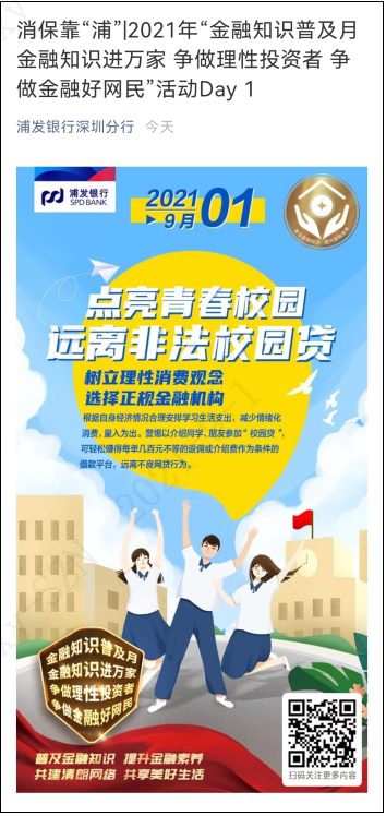 9月1日,也是校園開學(xué)的日子。開學(xué)的第一天,浦發(fā)銀行深圳分行特別推出“點亮青春校園遠(yuǎn)離非法校園貸”日歷宣傳海報,并在官方微信公眾號進(jìn)行轉(zhuǎn)發(fā)宣傳,同時在46家網(wǎng)點營業(yè)大廳顯示屏播放,重點傳播校園貸金融知識,提醒學(xué)生人群,合理消費,遠(yuǎn)離不良網(wǎng)貸行為。據(jù)悉,該行將在九月每個工作日持續(xù)發(fā)布消保宣傳日歷,常態(tài)化長效推進(jìn)金融知識普及月宣傳活動的開展。