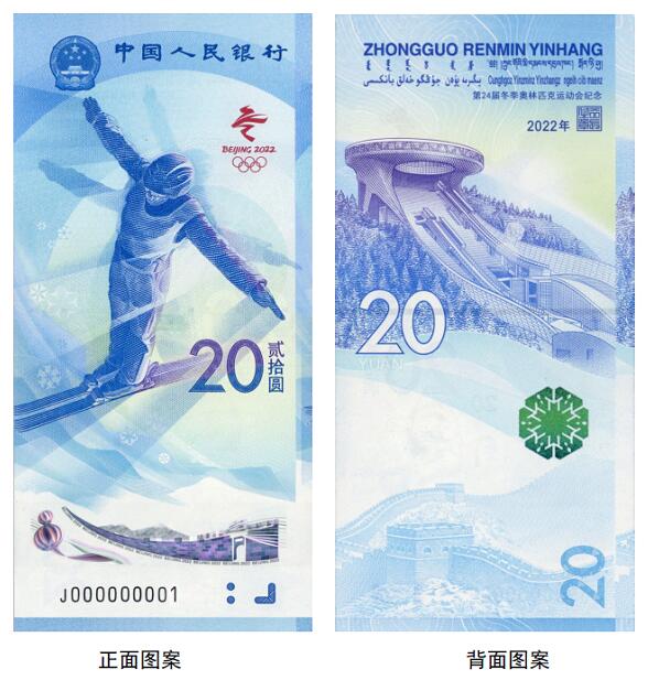 正面圖案:正面主景為自由式滑雪運動員圖案,上方為中華人民共和國國徽、“中國人民銀行”行名,右側(cè)為第24屆冬季奧林匹克運動會會徽、面額數(shù)字“20”與漢字“貳拾圓”,下方為動感全息圖案、盲文面額標記和冠字號碼。