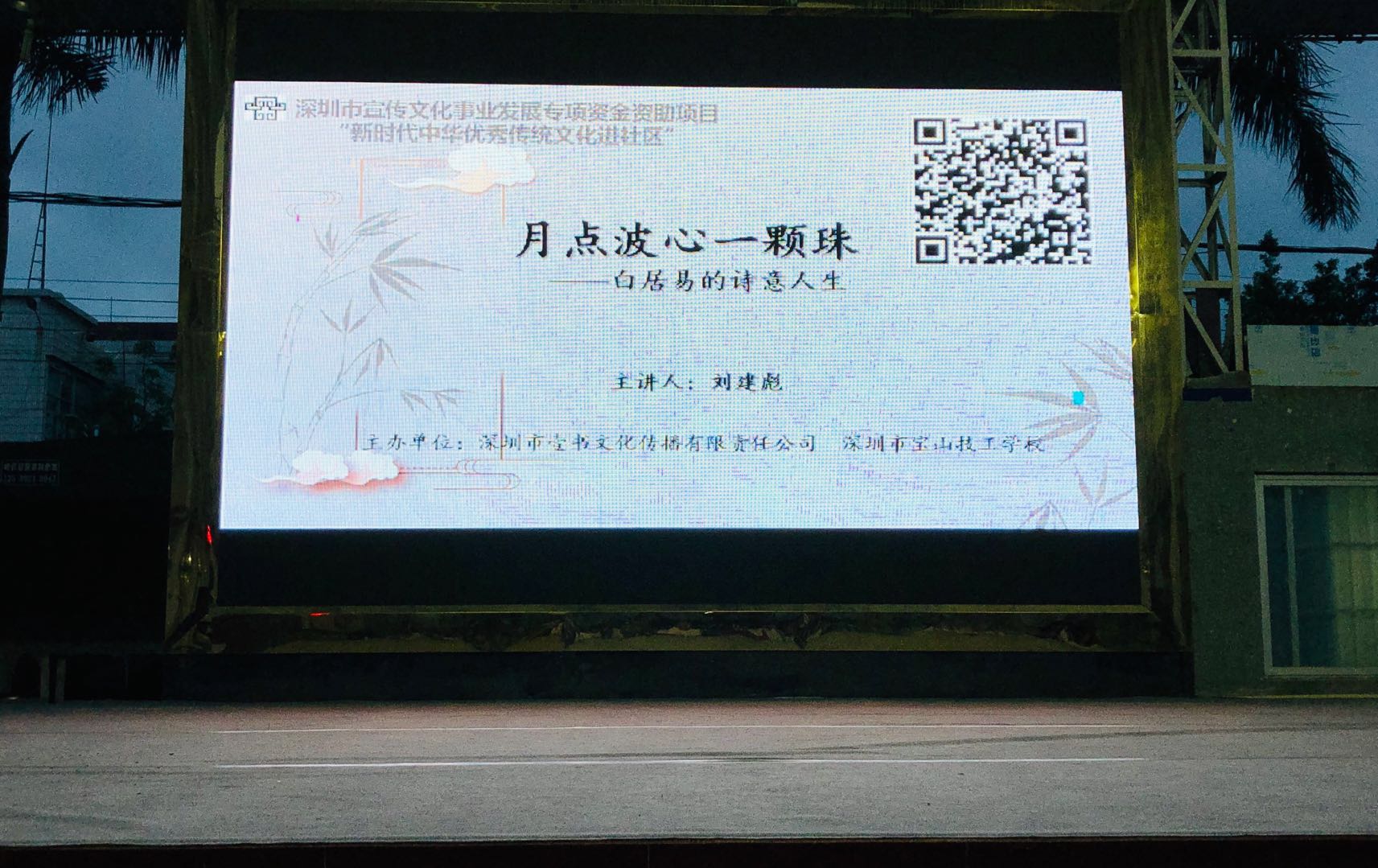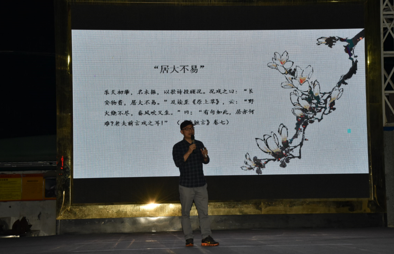 深圳新聞網(wǎng)訊 5月29日晚上,“新時(shí)代中華優(yōu)秀傳統(tǒng)文化進(jìn)社區(qū)”系列活動(dòng)第三場(chǎng)公益文化講座之“月點(diǎn)波心一顆珠——白居易的詩(shī)意人生”在深圳市寶山技工學(xué)校寶山大舞臺(tái)拉開(kāi)帷幕,由愛(ài)詩(shī)家創(chuàng)始人劉建彪帶領(lǐng)聽(tīng)眾一同走進(jìn)“詩(shī)王”的詩(shī)意世界,感悟其至情至性。