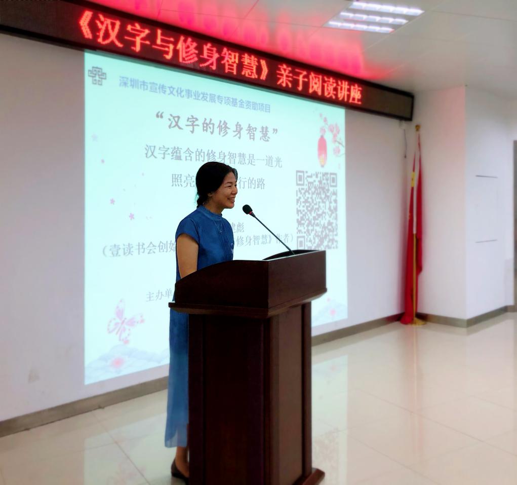 8月23日,首場公益講座“漢字蘊含的修身智慧是一道光,照亮青少年前行的路”在龍湖社區(qū)黨群服務中心舉辦。講座由深圳市閱讀聯(lián)合會、深圳市壹書文化傳播有限責任公司、龍湖社區(qū)黨委共同主辦。講座開始前,活動室坐滿了對傳統(tǒng)文化感興趣的青少年和他們的家人。每位小朋友都拿到了工作人員發(fā)放的《漢字與修身智慧》一書,并在家長的陪同下迫不及待翻開書籍,感受其中圖文并茂的漢字故事。龍湖社區(qū)黨委羅黎靜書記擔任本次講座的主持人,通過話家常開場,告訴聽眾漢字蘊含的智慧無窮無盡,點燃了在場的家長和小朋友們與主講嘉賓互動的激情。