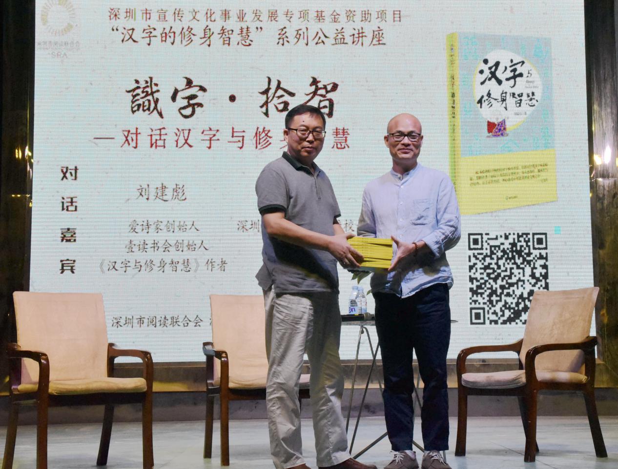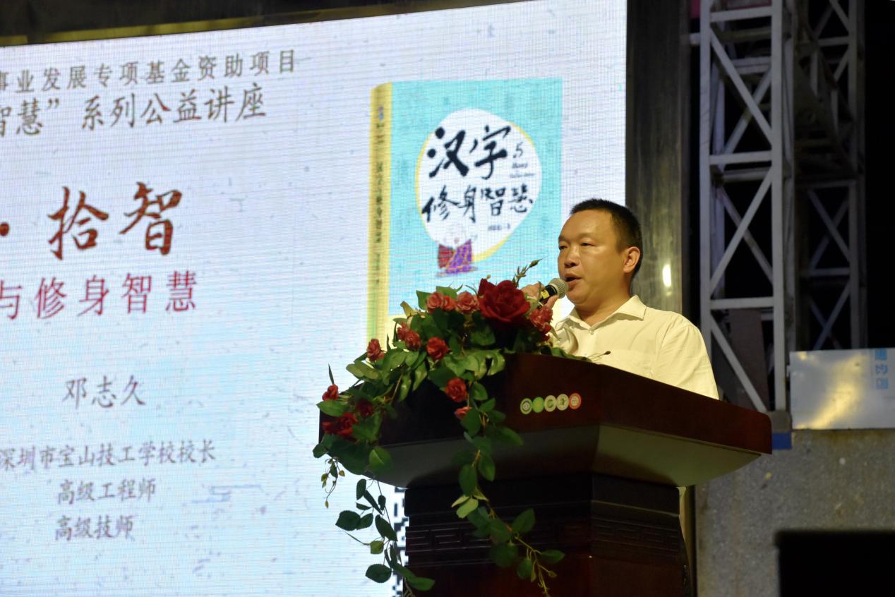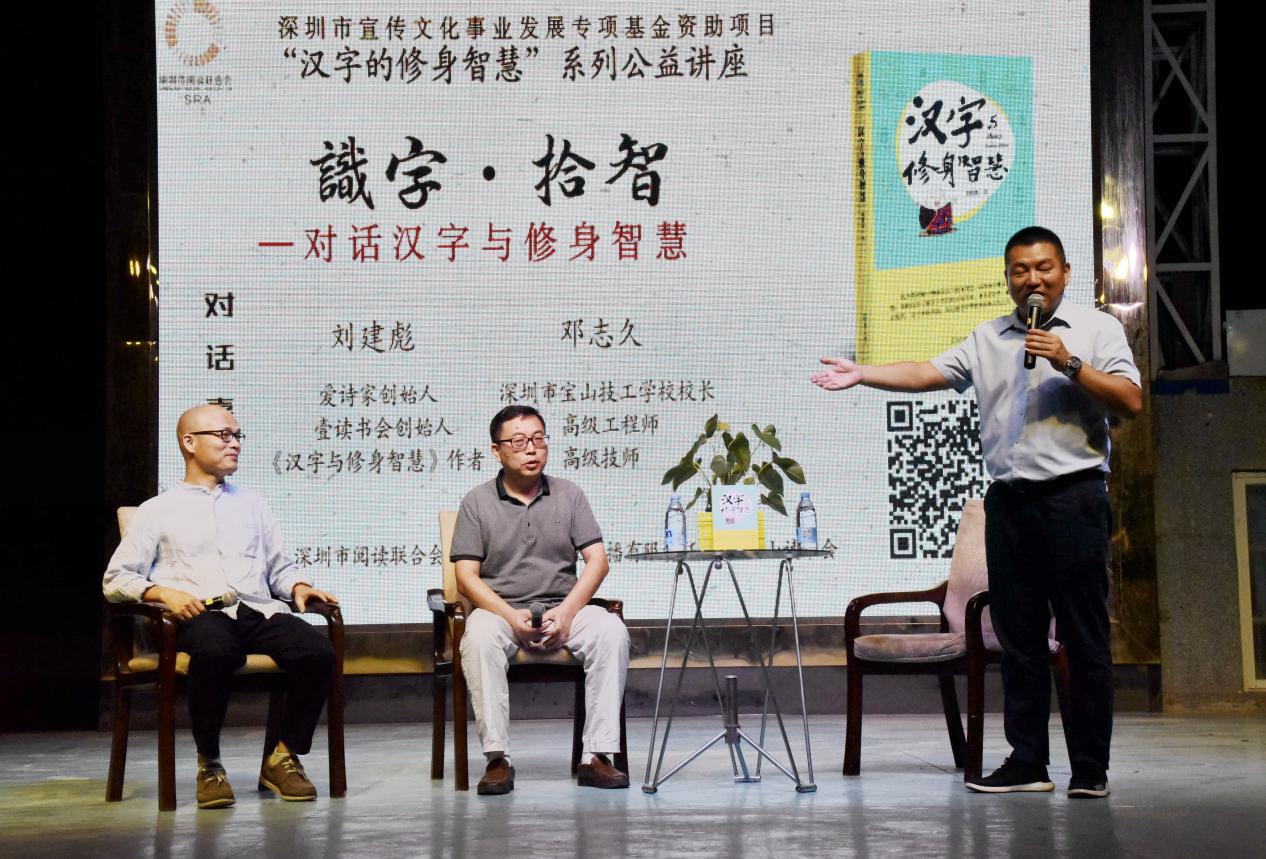深圳新聞網(wǎng)訊 9月18日晚上7時(shí),由深圳市閱讀聯(lián)合會(huì)、深圳市壹書文化傳播有限責(zé)任公司和寶山讀書會(huì)共同主辦的“‘識(shí)字拾智’——對(duì)話漢字與修身智慧”公益文化講座在寶山技工學(xué)校寶山大舞臺(tái)拉開(kāi)了序幕。據(jù)悉,這是由深圳市宣傳文化事業(yè)發(fā)展專項(xiàng)基金資助項(xiàng)目“漢字的修身智慧”的第三場(chǎng)公益文化講座,以劉建彪《漢字與修身智慧》新書分享為契機(jī),傳播漢字正能量,讓更多的青少年識(shí)字長(zhǎng)智,領(lǐng)略漢字文化之精妙。