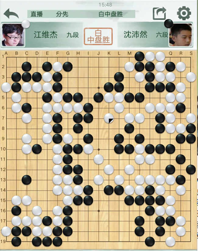 第四臺,沈沛然執(zhí)黑對陣世界冠軍江維杰。黑開局不利,右下角65緩手導致差距拉大。