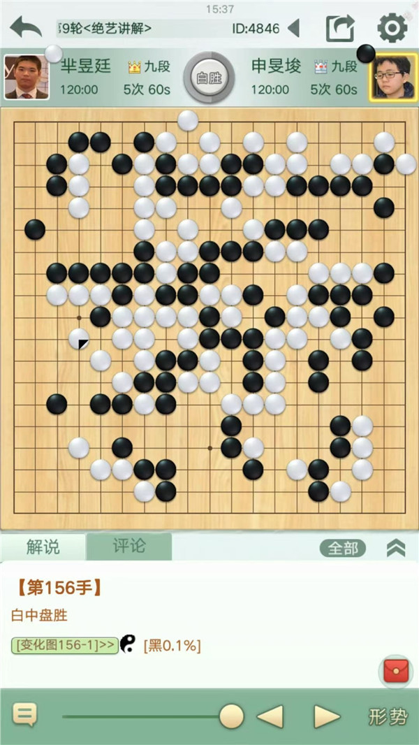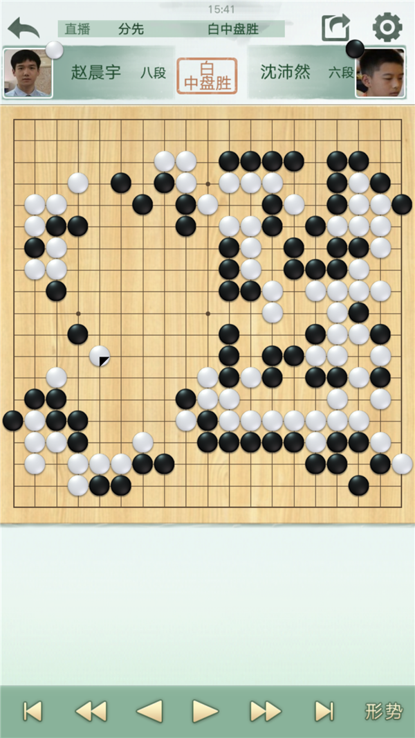慢棋第四臺由深圳宏發(fā)隊的沈沛然六段執(zhí)黑對陣江蘇隊的趙晨宇八段。白方開局步調(diào)良好,局面小優(yōu)。中盤時黑方企圖沖擊白棋薄味,但未能找到較為有效的手段。在形勢較為不利的情況下,沈沛然選擇了強(qiáng)行開劫拼搏,但無奈劫材不夠,轉(zhuǎn)換之后繼續(xù)虧損,再難挽回局面,可以說是白棋完勝的一局。