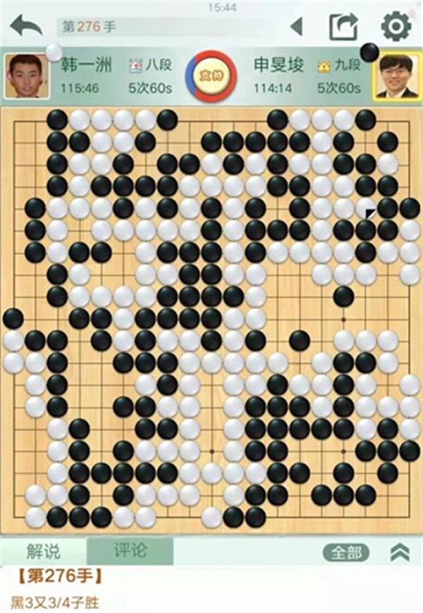 時(shí)越快棋執(zhí)黑對陣世界冠軍陳耀燁。中盤黑棋在右邊白勢中試應(yīng)手,白棋應(yīng)對松緩,被黑棋先手便宜十幾目棋,黑局面領(lǐng)先。之后黑棋行棋嚴(yán)謹(jǐn),中盤獲勝。
