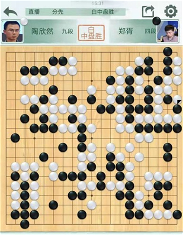 陶欣然執(zhí)白對陣小將鄭胥。黑棋開局在左邊虧損,局面落后。最后黑棋在右邊破釜沉舟尋求戰(zhàn)機(jī),白棋計(jì)算精準(zhǔn),將黑全殺,白中盤勝。