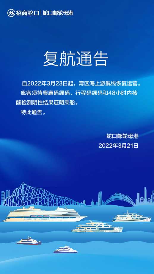 讀特客戶端 ·深圳新聞網(wǎng)2022年3月21日訊(記者 田志強(qiáng))記者從招商蛇口郵輪母港獲悉,自3月23日起,灣區(qū)海上游航線恢復(fù)運(yùn)營。搭乘該航線的旅客須持粵康碼綠碼、行程碼綠碼和48小時(shí)內(nèi)核酸檢測陰性結(jié)果證明乘船。