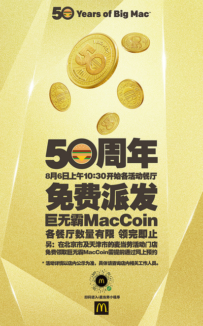 為了與中國(guó)消費(fèi)者一起歡慶巨無霸50周年,中國(guó)內(nèi)地指定麥當(dāng)勞餐廳將于2018年8月6日當(dāng)日免費(fèi)送出超過100萬枚MacCoin。早上10:30開始,顧客前往餐廳為巨無霸唱出生日歌[ 北京市和天津市的顧客需2018年8月4日上午9:00起在“i麥當(dāng)勞”微信小程序提前預(yù)約,方可于8月6日10:30起在指定麥當(dāng)勞餐廳領(lǐng)取。],即可獲得MacCoin一枚,圖案隨機(jī),送完即止。北京市和天津市的顧客需2018年8月4日上午9:00起在“i麥當(dāng)勞”微信小程序提前預(yù)約,方可于8月6日10:30起在指定麥當(dāng)勞餐廳領(lǐng)取。顧客可以分享與收藏,也可以在2018年12月31日前憑MacCoin在中國(guó)內(nèi)地、美國(guó)、荷蘭、新西蘭、巴西等全球超過50個(gè)國(guó)家和地區(qū)參與活動(dòng)的麥當(dāng)勞餐廳,免費(fèi)兌換巨無霸一個(gè)。
