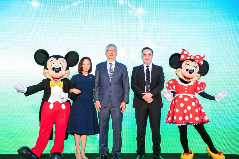 麥當(dāng)勞中國(guó)董事會(huì)主席張懿宸先生(中)、麥當(dāng)勞中國(guó)首席執(zhí)行官張家茵女士(左二)、迪士尼中國(guó)影業(yè)及品牌管理副總裁及總經(jīng)理徐隆立先生(右二)、米奇和米妮(左一及右一),共同見證合作