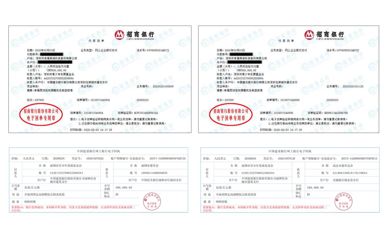 2月3日,深圳市幸福商城股份有限公司宣布,通過深圳市青少年發(fā)展基金會(huì)向武漢市慈善會(huì)、深圳市慈善會(huì)共捐贈(zèng)100萬元人民幣,用于疫區(qū)前線防治工作,并保障一線防疫醫(yī)護(hù)人員的安全。