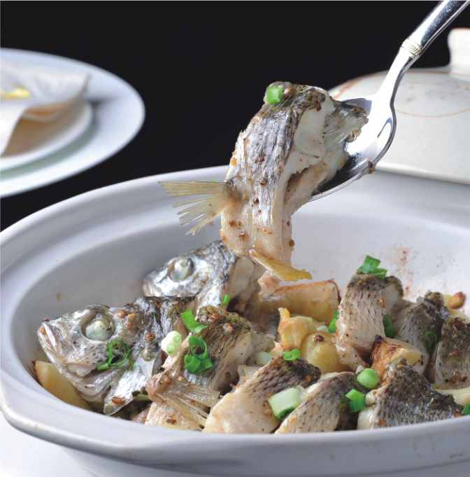 廣東人也會把立魚叫做“黃腳立”,立魚生長很慢,脂肪含量低,絲毫不見肥膩,最討女仔喜歡。立魚如果清蒸,則肉質(zhì)偏韌;雷大廚改以鹽焗,用砂鍋爆香姜蔥蒜,魚肉先經(jīng)鹽、糖、少許油、生粉和胡椒粒撈一撈,下鍋后蓋蓋子焗上五分鐘,入味后經(jīng)砂鍋一焗,緊緊鎖住肉汁。