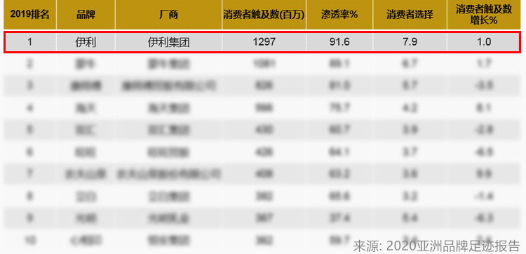 《2020亞洲品牌足跡報(bào)告》發(fā)布:每年近13億人次選擇,伊利連續(xù)五年登頂榜首
