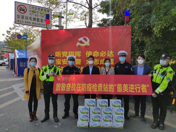 在深圳,2020年2月伊利攜手深圳市關(guān)愛辦及深圳新聞網(wǎng)發(fā)起“致敬‘最美逆行者’”活動(dòng),向深圳戰(zhàn)疫一線的民警、交警、醫(yī)務(wù)工作者、義工等進(jìn)行慰問和捐贈(zèng),先后前往光明區(qū)光明交警大隊(duì)、光明羌下公安檢查站、寶安區(qū)松安防疫檢查點(diǎn),為戰(zhàn)疫在一線的工作人員送上愛心牛奶與溫暖午餐。
