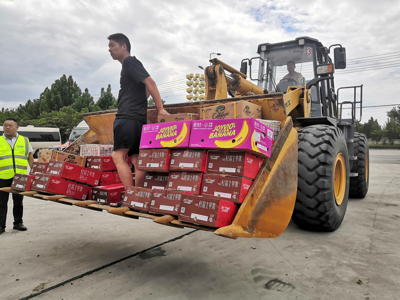 鏟車(chē)接力運(yùn)送賑災(zāi)愛(ài)心水果。