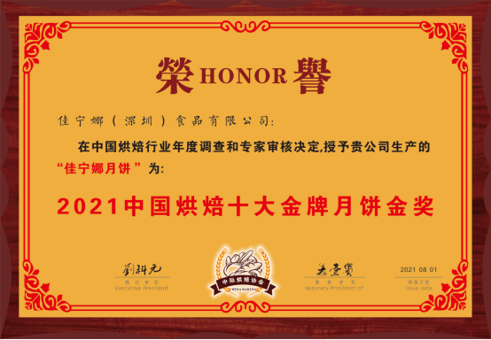經(jīng)過多年的發(fā)展與沉淀,佳寧娜月餅以先進的工藝、獨特的口味、卓越的信譽贏得消費者的信賴和支持,曾榮獲“深圳老字號”“深圳月餅節(jié)質量信譽獎” (連續(xù)12年 )“中國食品安全年會食品安全示范單位”“中國烘焙五仁月餅金獎”“中國烘焙廣式月餅金獎”“中國烘焙潮式月餅金獎”、“中國烘焙十佳名牌月餅”、“中國烘焙老字號月餅“等多項榮譽稱號。