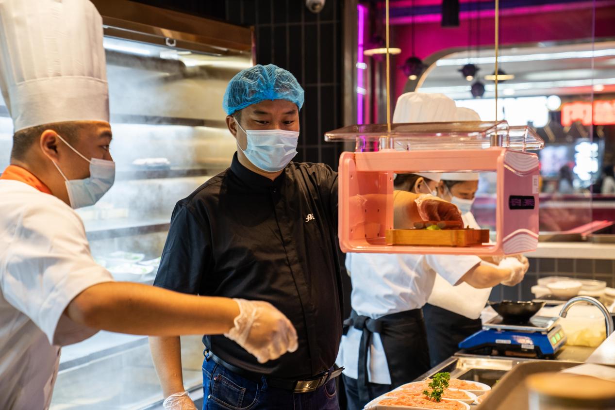 值得一提的是,除了地道的火鍋美食,這家餐廳的特別之處,在于高科技智能機(jī)器人的廣泛應(yīng)用。在餐廳過道里,一款名為“蠶豆”的配送機(jī)器人來回奔忙,把各式菜品有條不紊地送達(dá)顧客桌前。半空中,高效穿梭的云軌小車將菜品傳送到餐桌,“從天而降”呈現(xiàn)在顧客面前,科技體驗(yàn)感十足。這款“天降”智能云軌傳輸系統(tǒng),由智能配餐、智能云軌兩大模塊構(gòu)成。顧客通過手機(jī)下單后,智能配餐系統(tǒng)接到指令,能自動(dòng)將相應(yīng)菜品餐食分配給云軌小車,高效、快速地配送到對(duì)應(yīng)餐桌,整個(gè)送餐過程實(shí)現(xiàn)“零接觸”,在高效率的同時(shí),確保了安全衛(wèi)生。