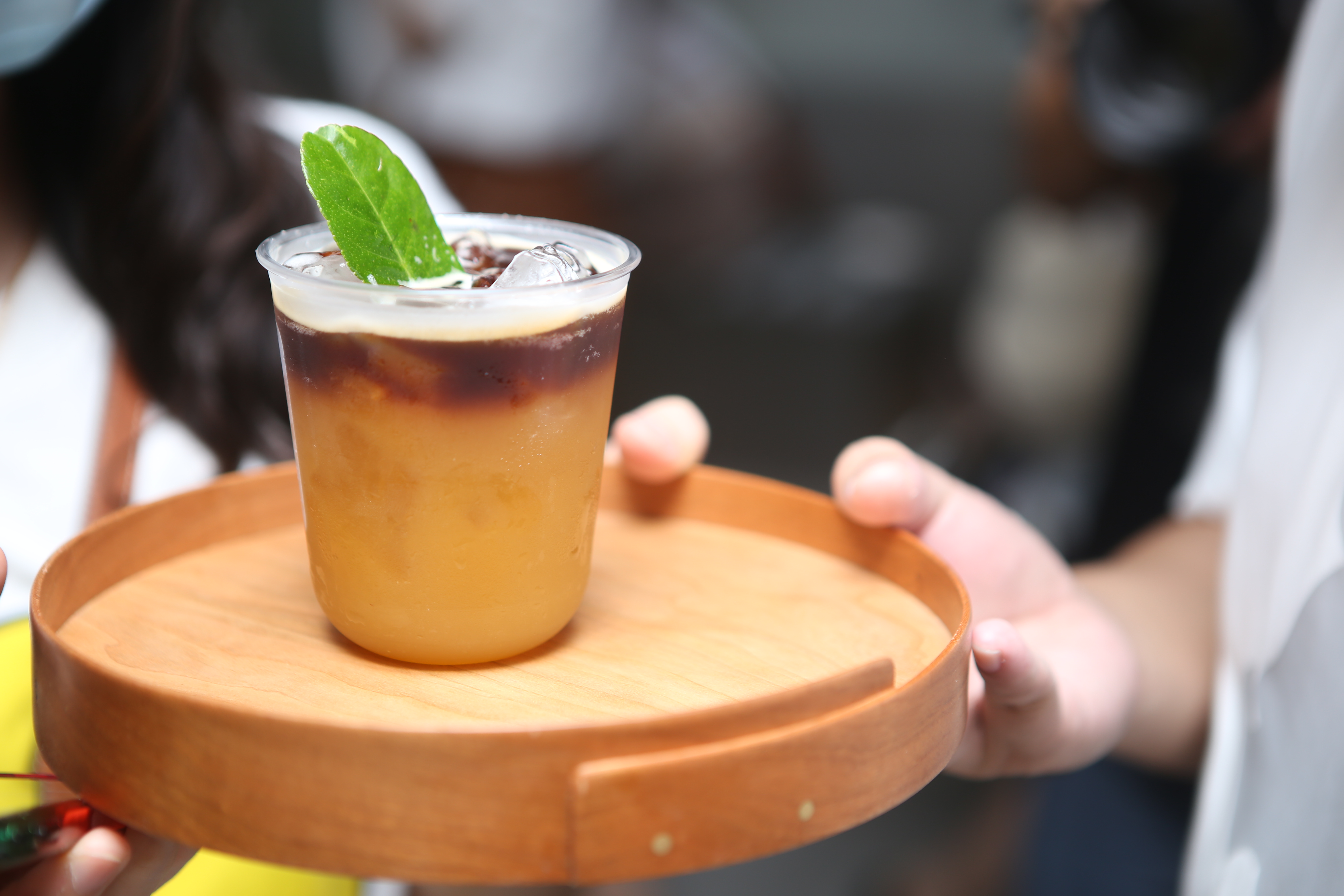 (門店工作人員熱情地為排隊顧客送上茶飲解渴)