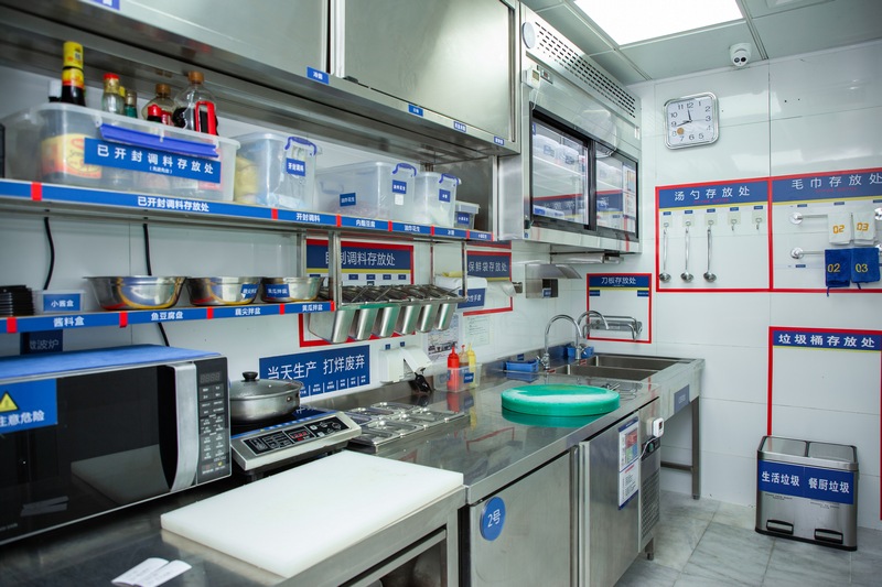 “右手邊是冷菜間,因?yàn)槭嘲惨蟾?,我們都有?zhuān)門(mén)的‘二次更衣室’,在這里更換衣服后,再進(jìn)入對(duì)涼菜進(jìn)行處理。”負(fù)責(zé)人表示,在專(zhuān)門(mén)的涼菜區(qū)里,則可以看到櫥窗中整齊地貼上了諸如“A1圣女果”“B04魚(yú)豆腐”之類(lèi)的標(biāo)簽,同時(shí)備注“當(dāng)天生產(chǎn)打烊廢棄”和“加工日期與廢棄日期”等具體操作指示?!懊客泶蜢群?,我們也會(huì)用紫外線燈對(duì)冷菜間進(jìn)行半個(gè)小時(shí)的消毒?!必?fù)責(zé)人補(bǔ)充。