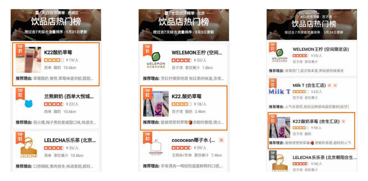 自帶流量的K22.酸奶草莓很快把店開進(jìn)了北京一線商圈——西單大悅城,并在當(dāng)時(shí)火速登頂大眾點(diǎn)評(píng)西城區(qū)熱門榜 TOP1,成為當(dāng)之無愧的北京排隊(duì)王。