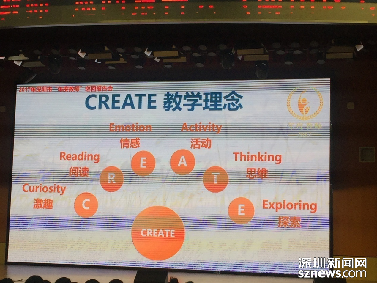 我有幸聽了一場深圳市年度教師的巡回演講,其中一個老師講到自己的幸福成長過程時,展示了自己獨有的特色教學理念——CREATE教學理念,如圖,她的所有課堂充現(xiàn)了激趣、閱讀、情感、活動、思維和探索等六大環(huán)節(jié),彰顯特色,成就精英,當你達到如此境界時,幸福感和成就感就會水到渠成,雖然不求人人成精英,但愿人人有特色。