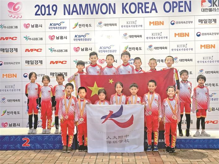 晶報(bào)05月16日訊 近日,韓國(guó)南原國(guó)際輪滑公開賽順利舉行,吸引了來(lái)自全球16個(gè)國(guó)家和地區(qū)的1000多名優(yōu)秀運(yùn)動(dòng)員參賽。晶報(bào)記者從人大附中深圳學(xué)校獲悉,該校小學(xué)輪滑隊(duì)的11名選手首次代表中國(guó)MX青少年隊(duì)參加了本次國(guó)際輪滑公開賽的小學(xué)(1&2年級(jí))的項(xiàng)目比賽,經(jīng)過激烈角逐,喜獲2金4銀13銅。值得一提的是,這是剛成立一年的人大附中深圳學(xué)校輪滑隊(duì)隊(duì)員們?cè)趪?guó)際舞臺(tái)上的首次亮相。學(xué)校以愛與尊重為核心理念,注重學(xué)生的全面發(fā)展,并注重突出發(fā)展學(xué)生特長(zhǎng),充分挖掘?qū)W生潛力,開設(shè)了豐富多元的課程,其中,開設(shè)了輪滑課等必修課,以及舞蹈、國(guó)際象棋等特色課程。