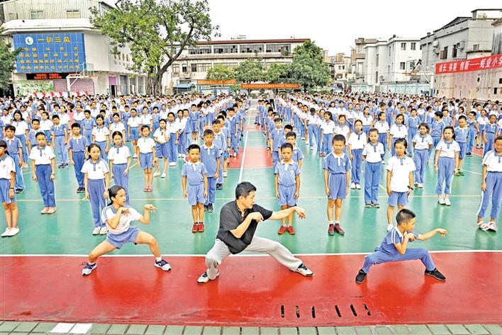 當天,利用課間陽光體育的時間,蠔業(yè)小學1000余名學生在校內饒有興趣地接受了華林派武術操的教學,華林螳螂拳代表性傳承人冼潤長師傅詳細地講解了武術操,并實地示范。華林派武術操是“華林螳螂拳”代表性傳承人冼潤長針對青少年所創(chuàng)編,融入了螳螂拳的武術元素,深受學生的歡迎?;顒硬粌H讓孩子深入了解優(yōu)秀傳統(tǒng)文化,還讓孩子“武”起來,益于舒緩學習壓力。