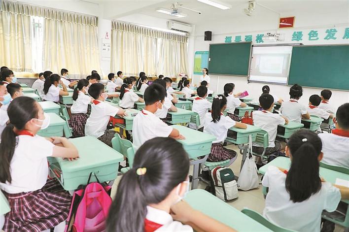 福強(qiáng)小學(xué)學(xué)生在教室收看同步直播的復(fù)學(xué)第一課。