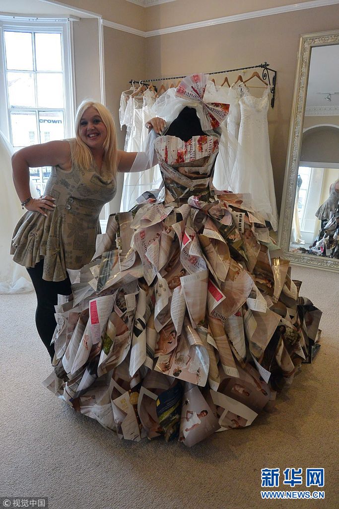 ????2015年3月23日消息(具體拍攝時(shí)間不詳),英國(guó),服裝設(shè)計(jì)師Kelly Currie利用舊的新娘雜志精心制作了一套婚紗,并在Bawtry時(shí)裝周閉幕時(shí)同其它禮服一起參加了新娘時(shí)裝秀。 (圖片來源:視覺中國(guó))