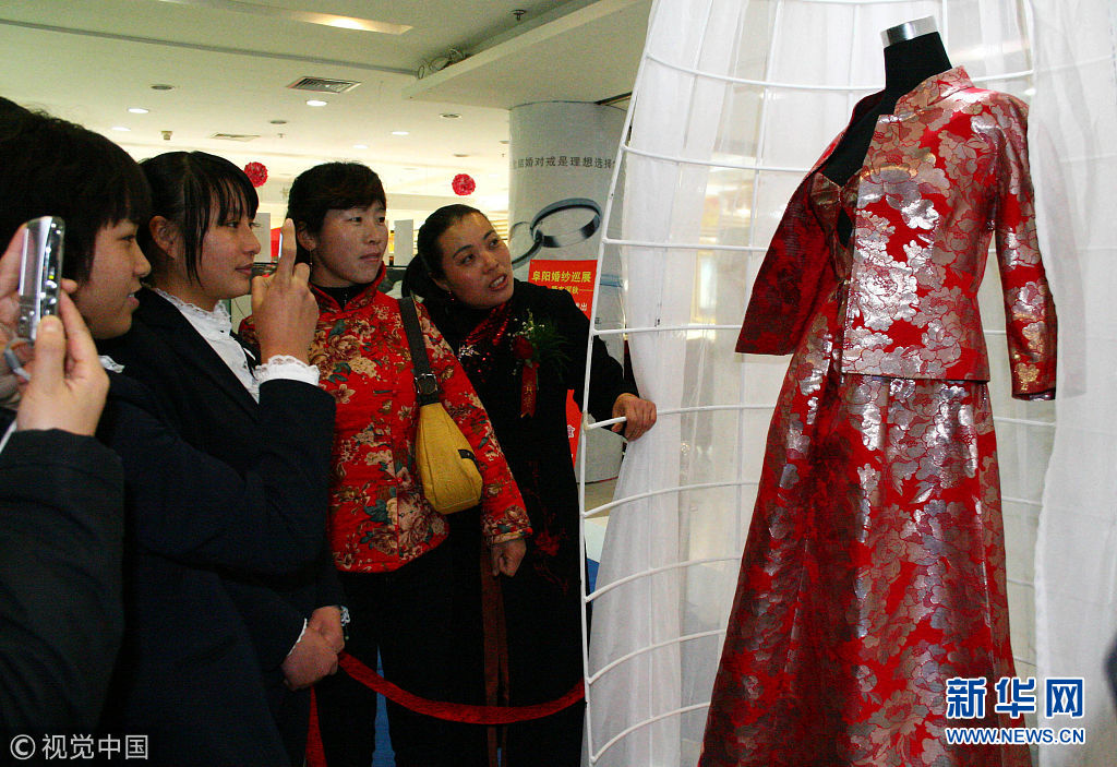 ????2007年11月16日 , 在安徽阜陽一家商場(chǎng), 一款由鉑金制成的婚紗吸引了人們的眼球。據(jù)介紹,這種鑲有鉑金的婚紗是由國(guó)際鉑金協(xié)會(huì)特別訂制,全球只有紅色、白色和紫色三款。(圖片來源:視覺中國(guó))
