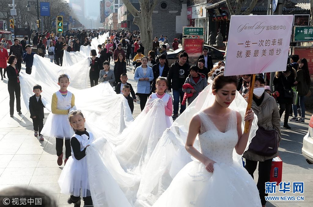 ????2016年3月13日,濟(jì)南商業(yè)街泉城路,一位模特身穿101米長(zhǎng)的婚紗行走亮相,震驚路人。據(jù)負(fù)責(zé)展覽的婚紗中心介紹,這套婚紗長(zhǎng)度101米,寓意百里挑一,耗資30多萬元專門定制的。(圖片來源:視覺中國(guó))