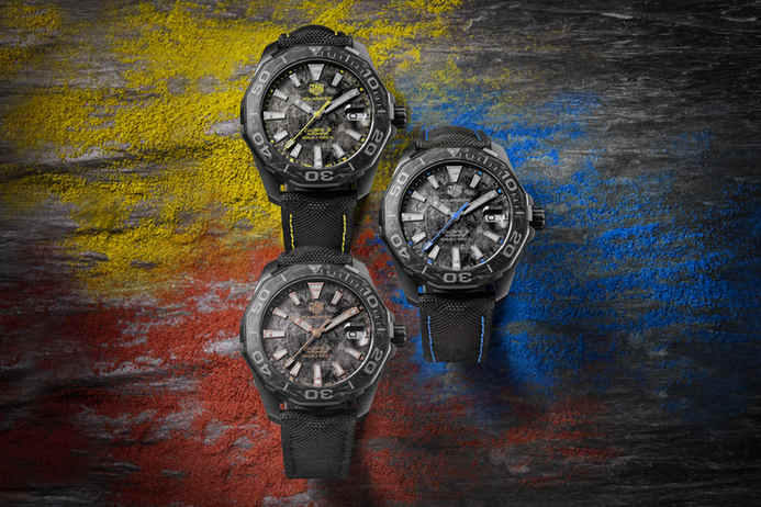 ????全新泰格豪雅Aquaracer競潛系列碳纖維腕表發(fā)布三個版本,分別以藍色、黃色和玫瑰金色元素點綴,別具一格。新款腕表采用41毫米PVD黑色鍍層鈦金屬表殼和碳質(zhì)表圈,表盤以碳纖維效果裝飾。這款堅固耐用的腕表更重要的特性是輕盈靈巧,而在全黑外觀上巧妙地以彩色點綴,盡顯優(yōu)雅時尚。