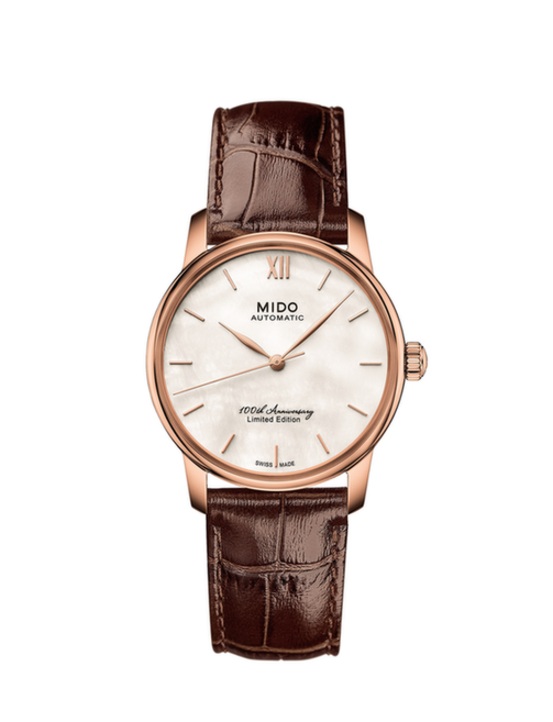 貝倫賽麗系列100周年限量款女士腕表擁有經(jīng)典、雅致的線條感,完美體現(xiàn)了瑞士美度表品牌歷經(jīng)歲月沉淀的經(jīng)典風格與日漸精益的制表工藝。由PVD鍍玫瑰金不銹鋼表殼環(huán)繞其中的白色珍珠貝母表盤,盡顯高雅亮潔之姿。飽滿渾圓的葉形時針和分針經(jīng)過沖壓工藝處理,搭配PVD鍍玫瑰金立體鑲嵌刻度,將精致典雅隱藏于細節(jié)之中。透過其雙面鍍防眩目涂層藍寶石玻璃表鏡,表盤精美非凡的細節(jié)展露無遺;搭配做工細膩的棕色小牛皮軋鱷魚紋表帶,于復古典雅間,盡情釋放溫婉女性的曼妙風韻。