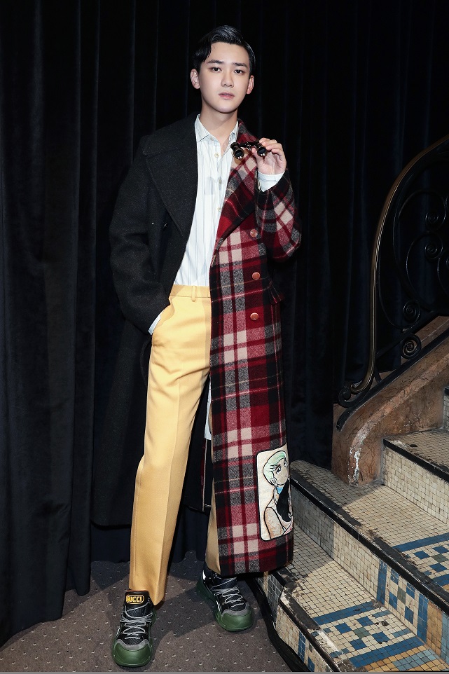 熊梓淇穿著Gucci2018秋冬系列Look49飾動漫圖案拼接大衣,條紋襯衣,搭配米色休閑長褲及Flashtrek系列運動鞋。
