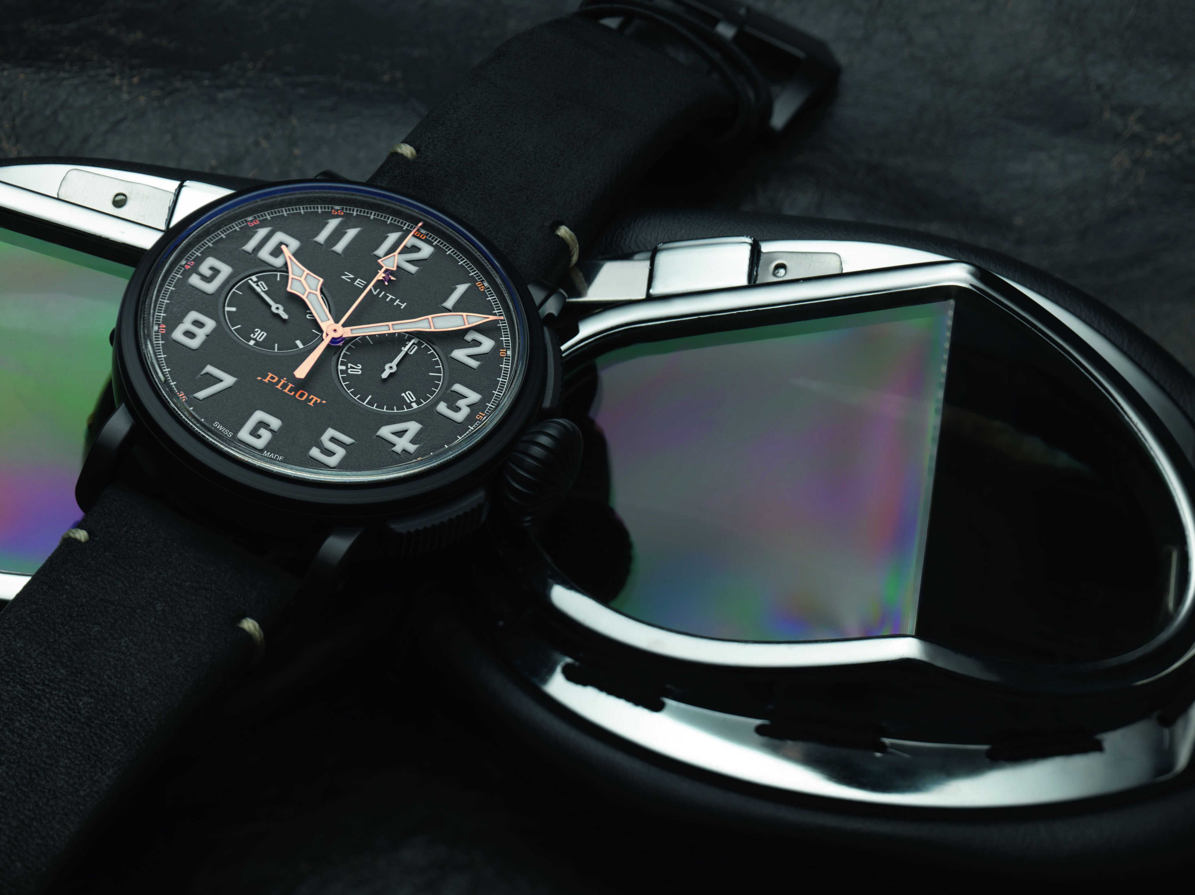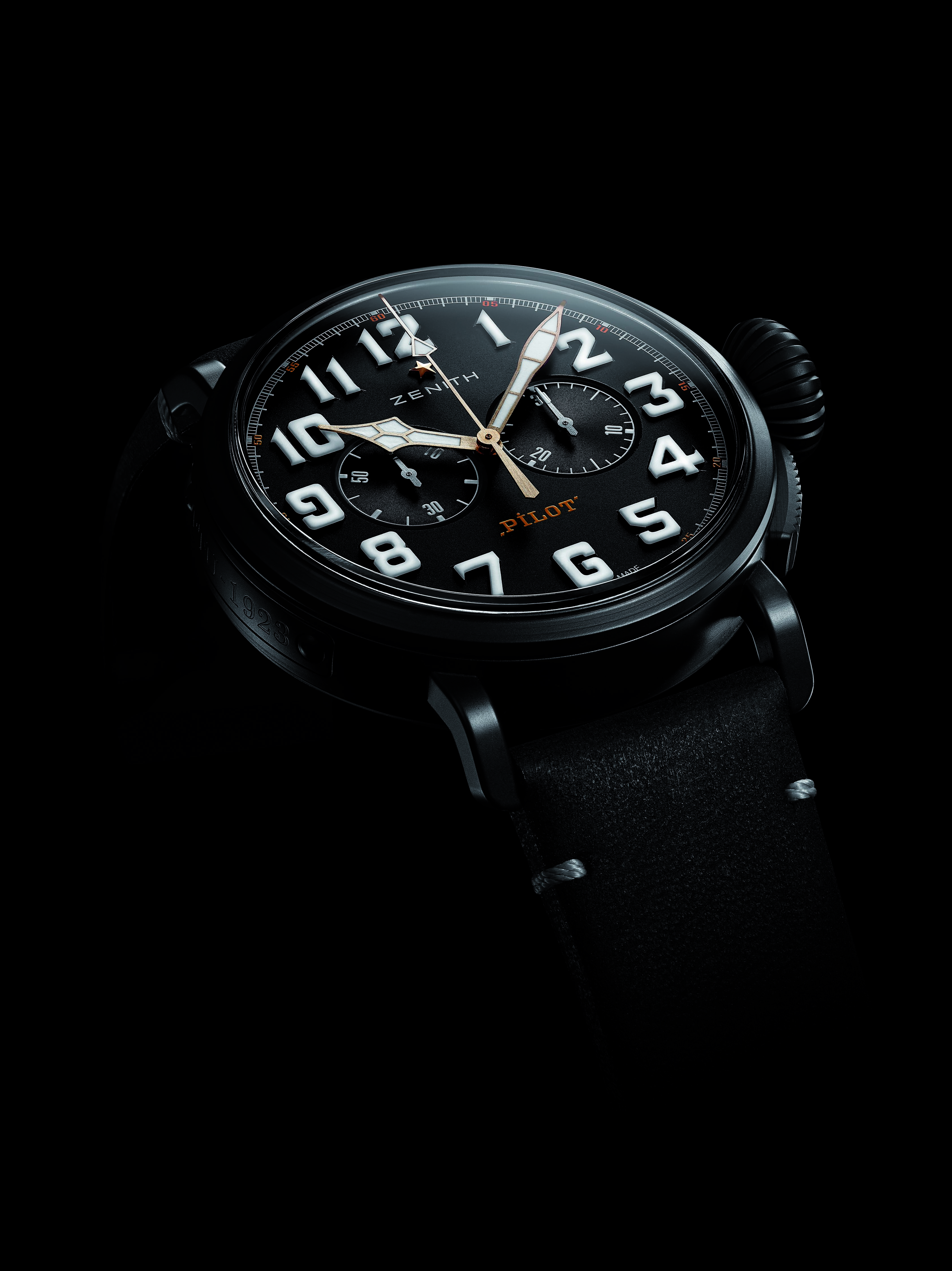新款黑色的表盤非常簡潔,不配備日期或日歷信息。大尺寸的分針和秒針(飛行員腕表的典型特征)以及阿拉伯?dāng)?shù)字時(shí)標(biāo)皆覆有SuperLumiNova?白色夜光涂層,外加雙計(jì)時(shí)碼表的輔助——9點(diǎn)位置的小秒針盤和3點(diǎn)位置的計(jì)時(shí)碼表分鐘計(jì)時(shí)器提供清晰的讀時(shí)。整塊腕表由真力時(shí)自制的傳奇EL PRIMERO4069型自動(dòng)機(jī)芯提供動(dòng)力,以5赫茲(每小時(shí)振動(dòng)36,000次)運(yùn)行,動(dòng)力儲備達(dá)50個(gè)小時(shí)。精準(zhǔn)的計(jì)時(shí)讓您穩(wěn)穩(wěn)地抓住每分每秒。